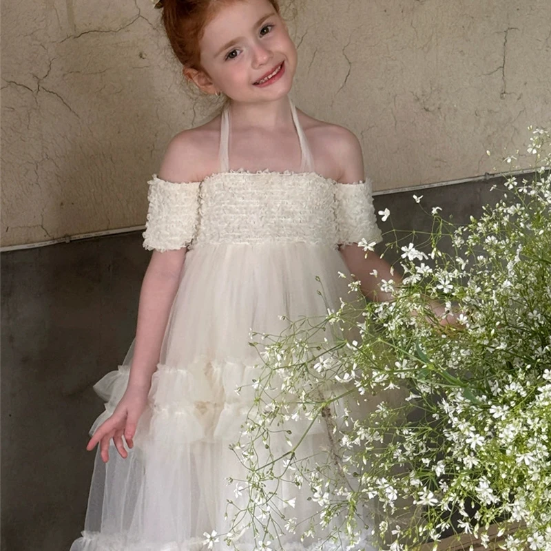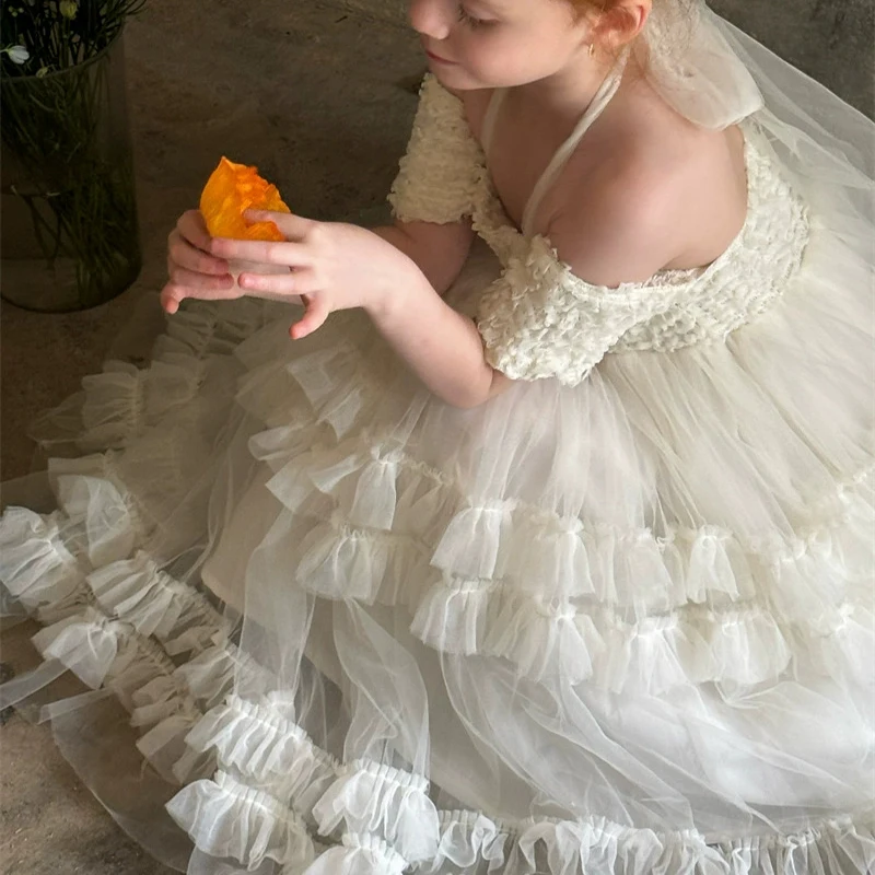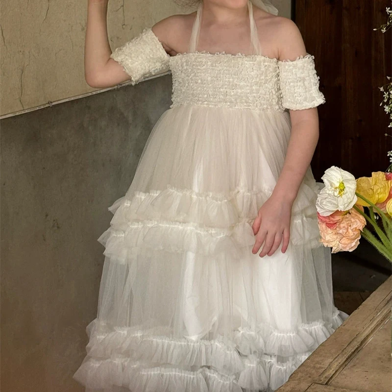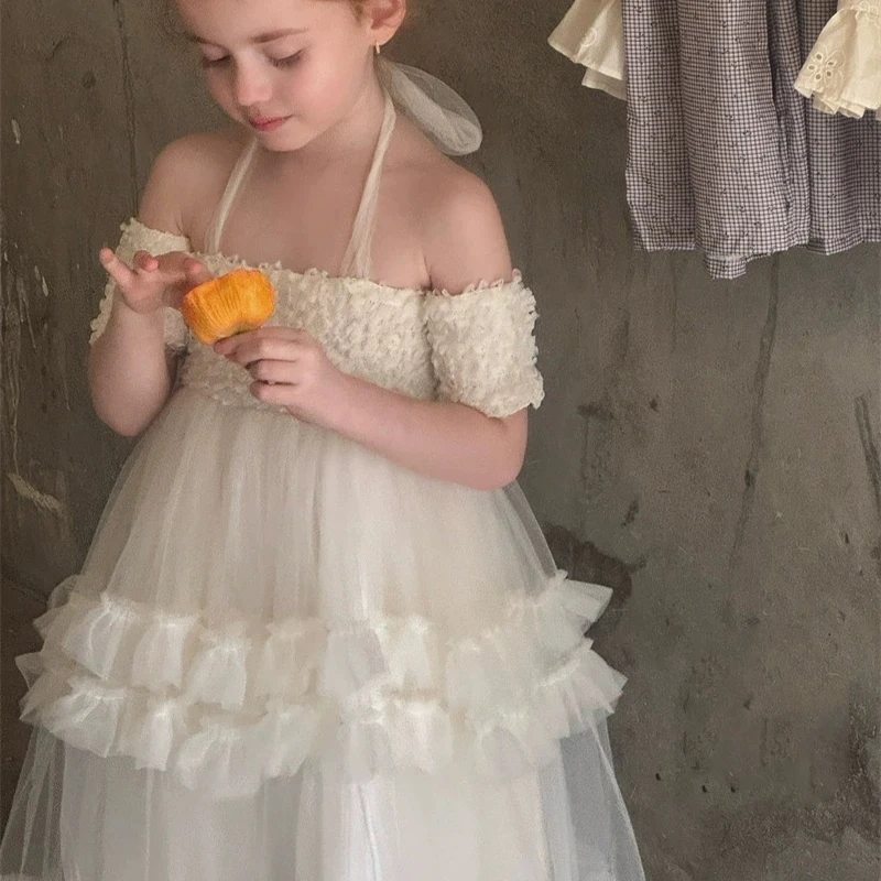Children's Formal Summer Dress with Tulle Ruffles and White Suspenders Embroidered Girls Clothing for Weddings and Parties